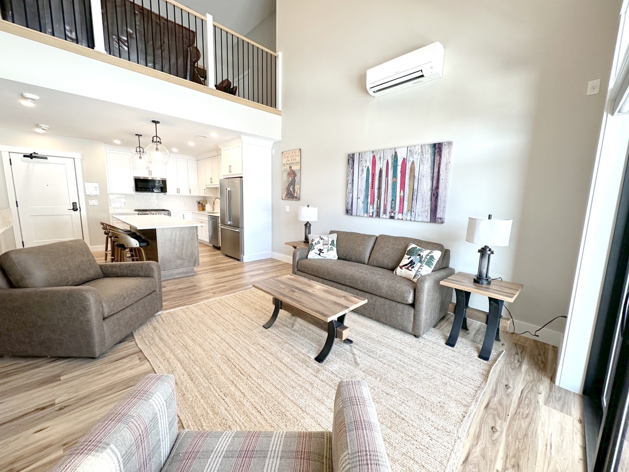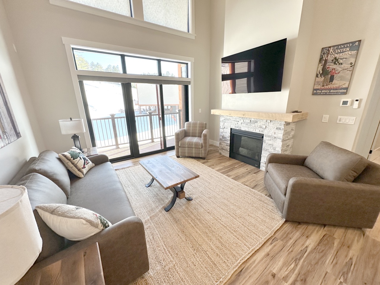 This bright, spacious two-level condo is a modern townhouse-style home located in a larger elevator building with beautiful views of the Cranmore Mountain slopes. It features a full kitchen with island, a cozy living room with gas fireplace, three bedrooms, an upper-level loft, in-unit laundry, and three full baths. Enjoy added convenience with ski lockers in the building, easy parking in the lot, and the ability to walk right to the slopes for effortless mountain days.